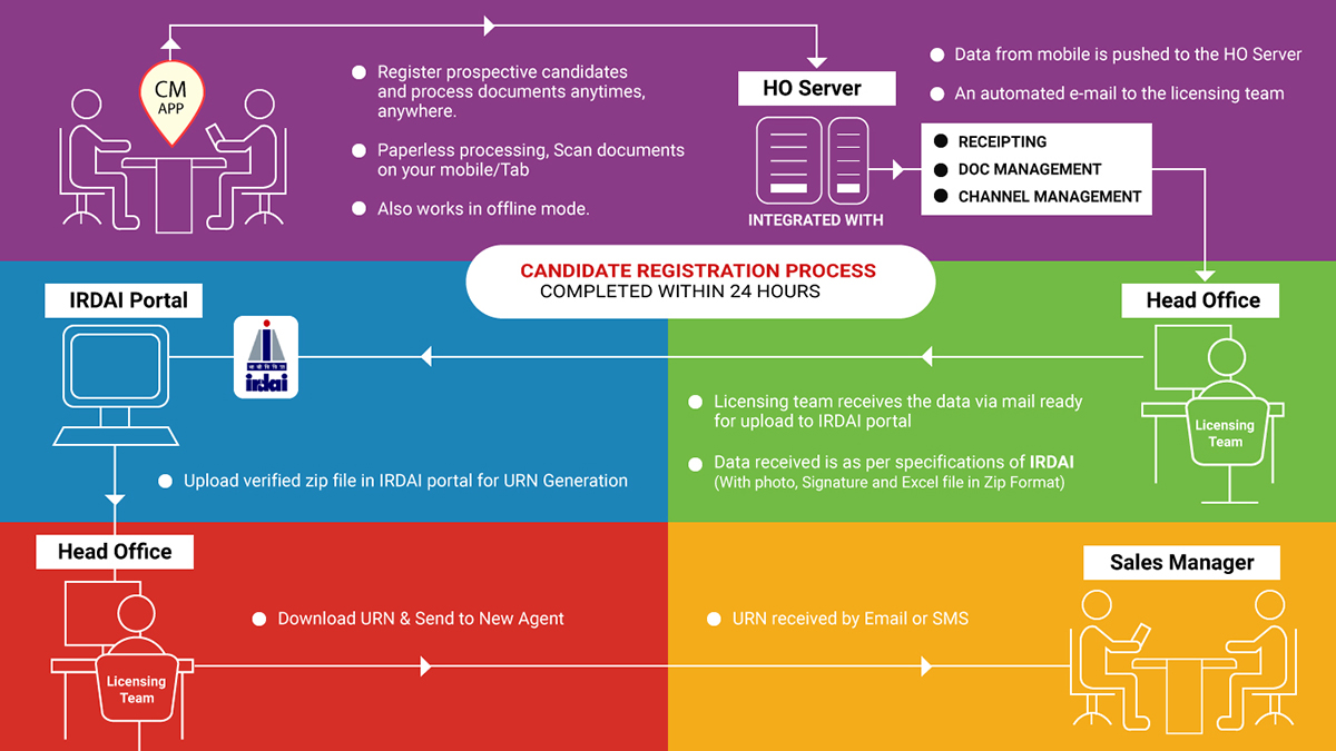 The submission process is simplified by the use of the Mobile app right from the point the sales manager approaches the agent to the point the agent has been finally on-boarded.